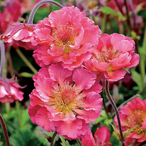 咲き進んだ花を切り戻すことで、再び楽しめる。本種は英国育成の珍しいピーチピンク色花。コンパクトな草丈でフリルのように重なる八重咲き花が華やか。バラ科