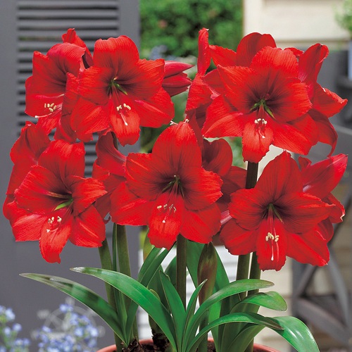 鮮赤色花。栽培しやすいサイズ。通称「アマリリス」。春と秋は生育旺盛なので水をよくやり、真夏と真冬は半休眠するので水を控えるのがポイント。ヒガンバナ科