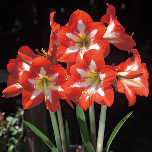 朱赤色の中央に白が入る花。通称「アマリリス」。春と秋は生育旺盛なので水をよくやり、真夏と真冬は半休眠するので水を控えるのがポイント。ヒガンバナ科