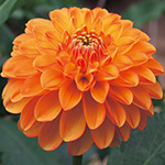 さわやかなオレンジ色の整然と美しいフォーマルデコラ咲き。強健で、切り花でも人気。キク科