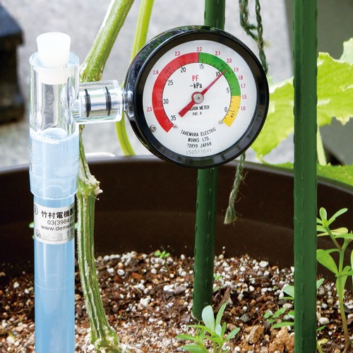 水分率(%)で土中の水の量を示すより、土から水を奪う力で土の水分状態を示したほうが作物の生育に密接な関係といえます。この水分張力(pF)値を測る土壌水分計テンションメーターです。陶器のカップは簡単に交換ができます。棒部に目盛付、作物に合わせて土壌に挿入してください。水分の適正範囲を色で表示。(日本製)