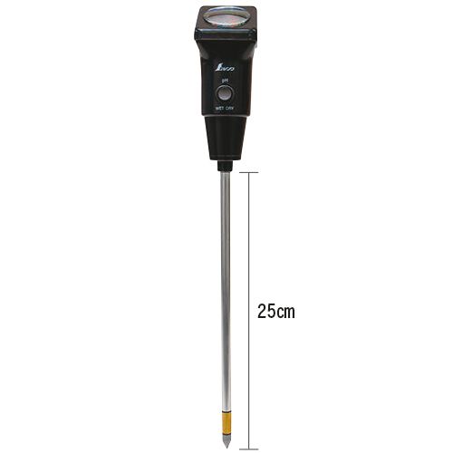 乾電池などを必要としない、アナログ式の土壌酸度計です。太めで長いプローブ部分は土壌の深部までしっかりと挿し込めます。アナログ式で起こりがちな水分不足による計測不良を防止するための水分コンディションチェック機能付き。メーター部分は土壌に挿し込んだ際に読み取りやすい角度に設計されています。(中国製)