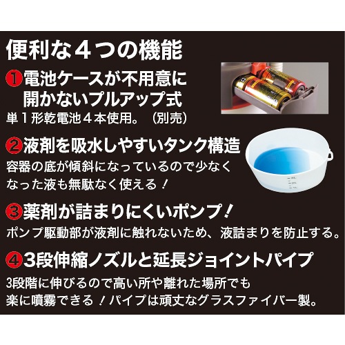 仕様:ホース長さ(約):160cm、1分間当たりの噴霧量:毎分260ML、1分間当たりの噴射量:毎分550ML、電池寿命:噴霧液量約117L、動作時間:約7時間半、噴射飛距離:約4m(斜め45度)