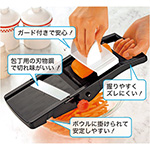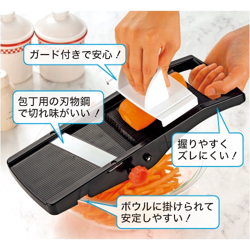 新潟県の刃物産地で伝統ある技術によって作られた包丁用ステンレス刃物鋼の刃なので、切れ味が違います!ブレずに持ちやすいガードホルダー付き。ダイヤルを回すだけで3種類の切り方ができ、ブレードを替える必要がありません。厚さも0.8~6mmまで調節できる優れものです。(日本製)