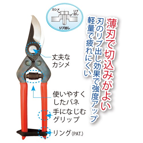 1910年の創業よりハサミ一筋専門メーカーの剪定鋏。かつて、ハサミは職人が長年の経験とカンで一つひとつ手作業で作り、今はその職人の切れ味を研削ロボットが再現。プロのユーザーをも満足させる逸品です。(日本製)