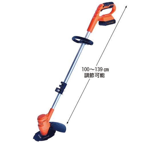 フル充電で約35分稼働!刃は金属刃と、際刈りに適したナイロン刃の2種類あるので、用途に合わせて使い分け可能。ポール長さ、ハンドル位置は調節可能です。最短1mとコンパクトに収納でき、コードレスなので持ち運び、メンテナンス、刃の交換も簡単です。(製造:中国 企画:アメリカ)