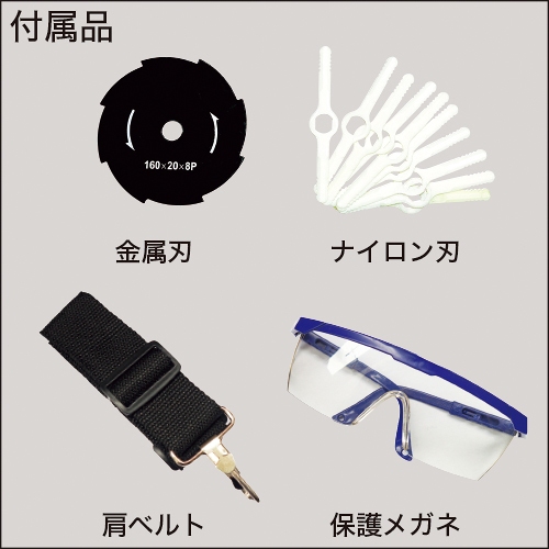 刃(金属刃・ナイロン刃)、バッテリー、充電アダプタ、肩ベルト、保護メガネ