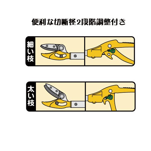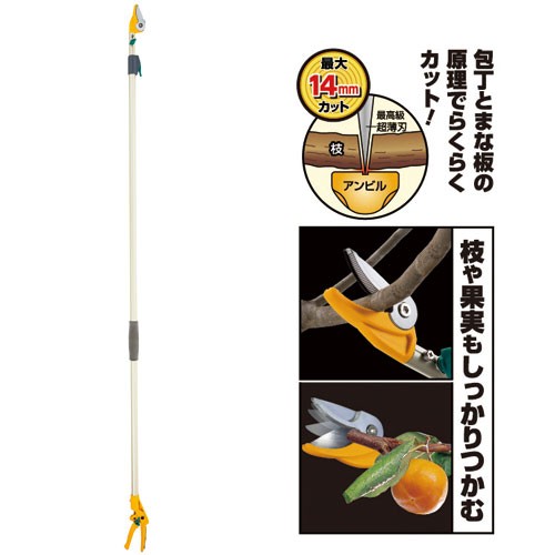 重量860gの超軽量タイプの高枝切鋏です。1.8m~3mまで伸ばすことのできる13段階伸縮により高い樹木でも剪定が可能です。アンビル刃の形状により、包丁とまな板の原理で最大14mmまでの太枝もカットでき、枝や果実もしっかり切ってからつかめる、可動式のキャッチがついています。また枝の太さに合わせて、刃の開く角度を手元のハンドル部分で2段階に調整。素早く剪定ができます。(中国製)