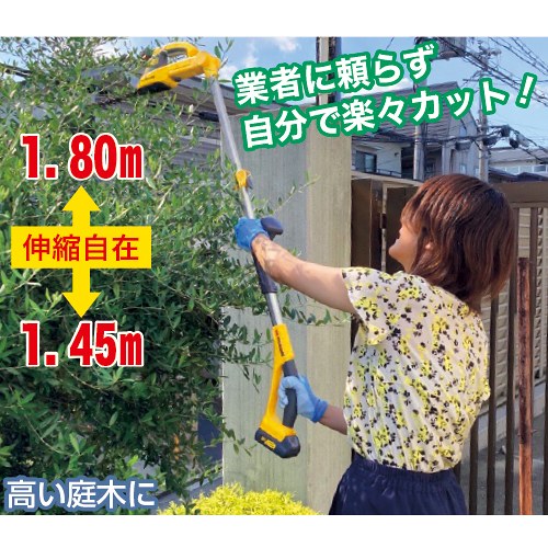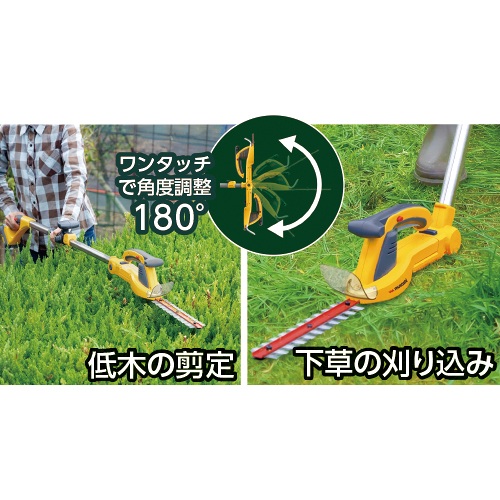 1台でポール式バリカンとハンディバリカンの2役をこなします。ポール式で使う場合は、バリカンの角度をワンタッチで180度調整できるので、高所はもちろん、草刈りから生け垣の剪定まで使いやすい角度に変えられます。手の届く範囲の剪定にはポールを取り外しハンディとして、狭い場所でも取り回しよく作業ができます。刃は切れ味がよく、さびにも強いハードクロムメッキ仕上げ。(中国製)