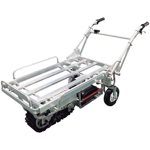 充電電動モーター式の手押し車です。ホイルインモーター式クローラーを搭載しているので、滑りやすい地面や荒れた地面の走行、側溝をまたぐ走行などがスムーズになります。(日本製)