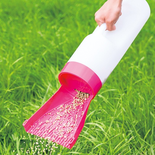 粒状の資材を手を汚さず、腰をかがめず、片手で楽に均一にまけます。細粒用と中粒用の2つのアダプターを付けかえ、さまざまな大きさの粒に対応します。(日本製)