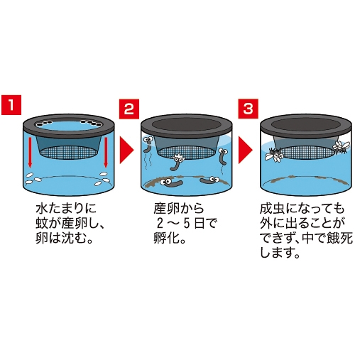 蚊の黒色を好む習性を利用し、容器内に産卵させます。卵は水中でふ化し、成長して蚊(成虫)になりますが、蚊は網目を通り抜けることが難しく、外へは逃げられないため容器内で死滅します。生活圏内に発生した蚊を都度駆除するのではなく、容器内で一度に多数の蚊を駆除することができるため、産卵するかを減らし、「いつの間にか蚊がいなくなる」効果を生み出します。