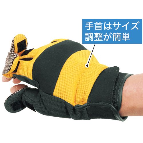 母指から中指までの3つの指先が脱着でき、指先を使う作業の際に便利です。てのひら部には振動吸収パッド、握り部分には滑り止めにシリコンの網模様が入っています。手の甲の伸縮素材で握りやすい効果が。(中国製)