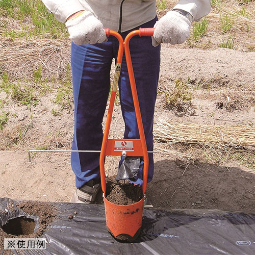 立ったまま、マルチの上から差込み、回して引上げると、マルチ穴・植穴・施肥穴があけられます。ポット苗をホーラーに納め、マルチの上から直接穴を開けながら差し込み定植できます。ハンドルは腕に負担がかかりにくい設計で、植え付け間隔を測る株間測り(最大45cm)も付いています。(日本製)