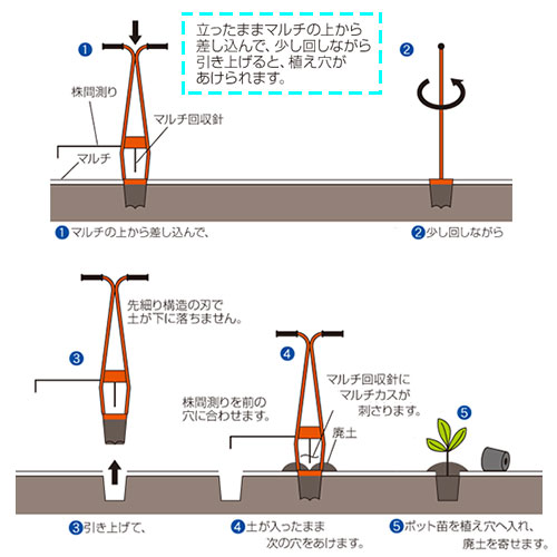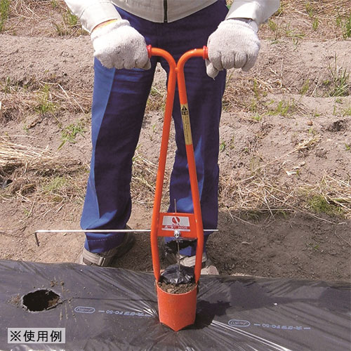 立ったまま、マルチの上から差込み、回して引上げると、マルチ穴・植穴・施肥穴があけられます。ポット苗をホーラーに納め、マルチの上から直接穴を開けながら差し込み定植できます。ハンドルは腕に負担がかかりにくい設計で、植え付け間隔を測る株間測り(最大45cm)も付いています。(日本製)