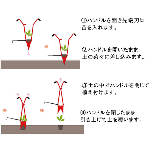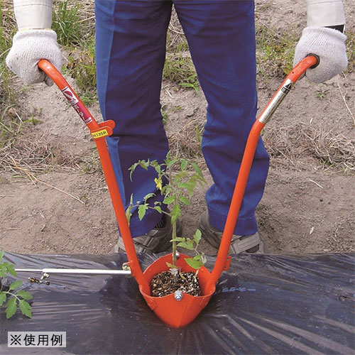 ポット苗をホーラーに納め、マルチの上から直接穴を開けながら差し込み定植できます。ハンドルは腕に負担がかかりにくい設計で、植え付け間隔を測る株間計りも付いています。(日本製)