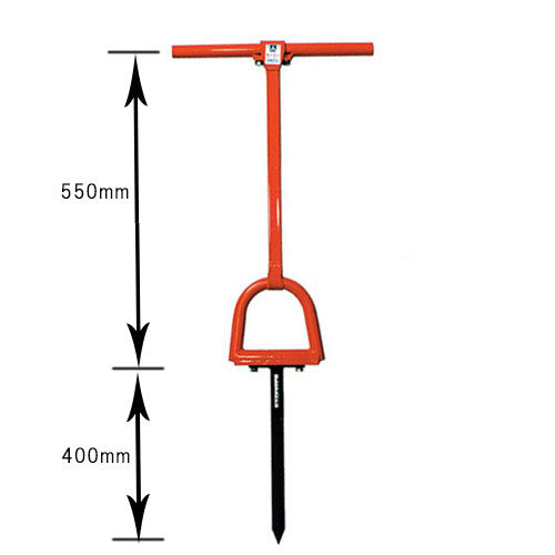 柔らかい所は足踏みで、堅い所は木槌で打ち込むことができる下穴・追肥穴あけ器。中央のステップに足をかけ、体重を利用して押し込めるので、効率よく穴あけができます。(日本製)