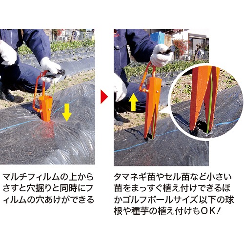 ・植穴が小さく、タマネギ苗やセル苗など小さい苗をまっすぐ簡単に植え付けできます。