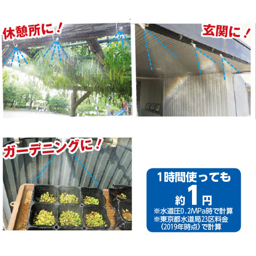 猛暑対策として学校や自治体で取り入れられているミストシャワーのご家庭版。ドライバーと水道があれば、5分ほどで設置可能。ハウスや玄関・軒下などに手軽につけられ、エアコンの人工的な風が苦手な方や植物にもおすすめです。チューブをお好みの位置でカットして間にミストノズルを接続することも可能。丈夫で、きめ細いミストを生み出す、品質のよいミストノズル3個入り。(日本製)