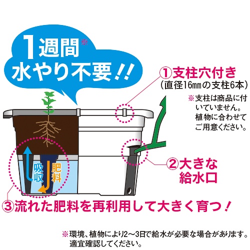 野菜にも花にも適した貯水機能付きの大型プランターです。底面吸水方式で貯水量は17リットルと超大容量なので、水やりの手間を大幅に軽減できます。貯水槽に流れ出た肥料成分が再び水と一緒に吸収されるので、肥料も有効活用できます。(日本製)