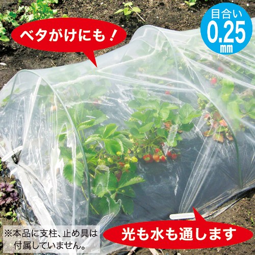 0.25mmの目合いでコナジラミなどの微細害虫を防ぎます。極細強力糸使用で通気性がよく、ネットの上からの散水も可能です。光もしっかり通し、やわらかな素材を使用しているので作物を傷めることがなく、ベタがけにも使えます。(日本製)