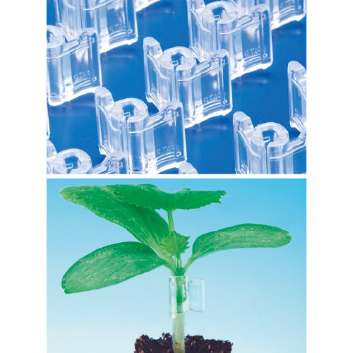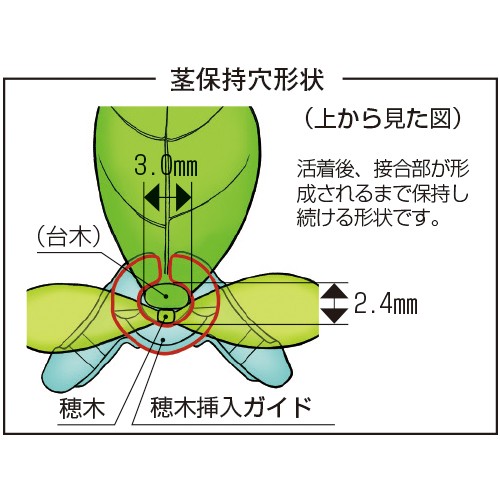 キュウリなどウリ科の片葉合わせ接ぎに使いやすく、接合部がきれいに仕上がります。透明なので切断面の合わせや接合状態を容易に確認ができ、摘み部は指先で摘み開く時に使いやすく、持ちやすい形状になっています。(日本製)