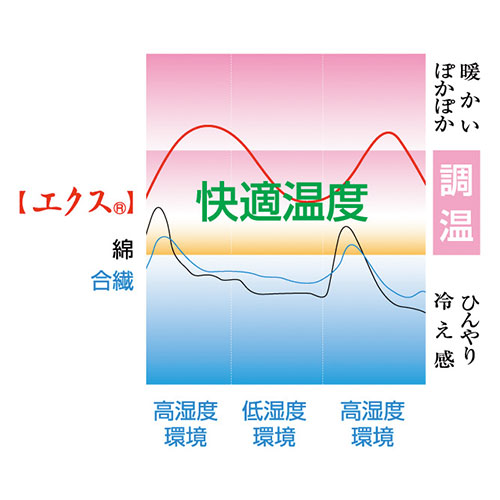 ○調温(吸湿により熱を発して快適温度域に移っていく)の機能をもち、快適な着心地を楽しめる繊維です。