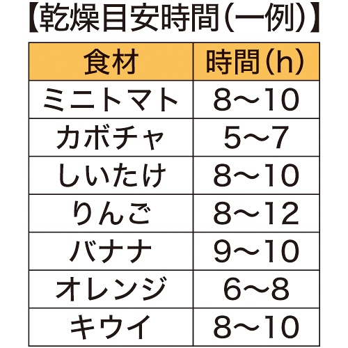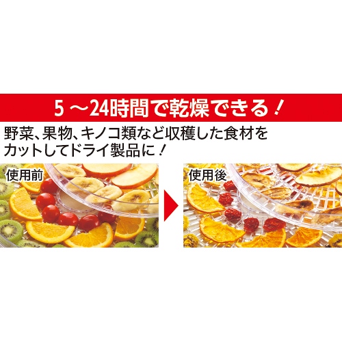今まで乾燥に時間がかかっていた食材も、家庭用電源を使って手軽にドライ製品にできます。5~24時間で乾燥できる!野菜、果物、キノコ類など収穫した食材をカットしてドライ製品に!(中国製)