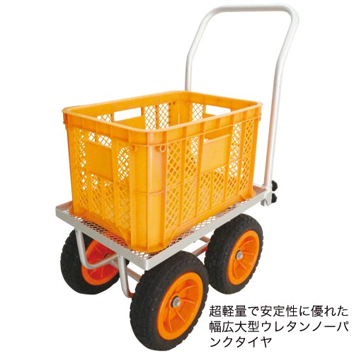 メッシュ付荷台なので、小型の荷物等も乗せることができます。超軽量で安定性に優れた幅広大型ウレタンノーパンクタイヤ(直径25cm)で悪路も楽々走行!荷台は収穫コンテナが1個乗る大きさです。(中国製)