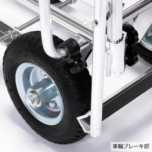 後輪をしっかり止めるブレーキと、車輪の幅、荷台の幅、荷台の長さを調節できます。タイヤはノーパンクタイヤ、フレームはアルミ合金で耐久性に優れた便利なハウスカーです。(中国製)