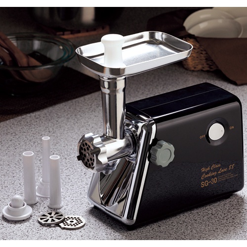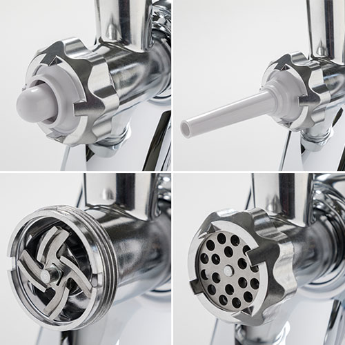 粗挽き・中挽き・細挽きと3種のカットプレートとソーセージアタッチメントが付属しており、付け替えれば好みの粗さのミンチがスイッチを押すだけで簡単にできます。家庭用の小型サイズながらパワフルで、自家製味噌をはじめ、すり身、ソーセージ、蒸しイモのマッシュなど手間と時間がかかる下ごしらえが手早く済ませられます。(中国製)