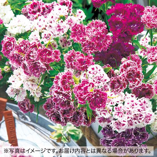 切れ込みの入る花弁の八重~半八重咲き。豪華な雰囲気のバイカラーミックス。ナデシコ科