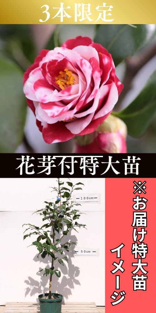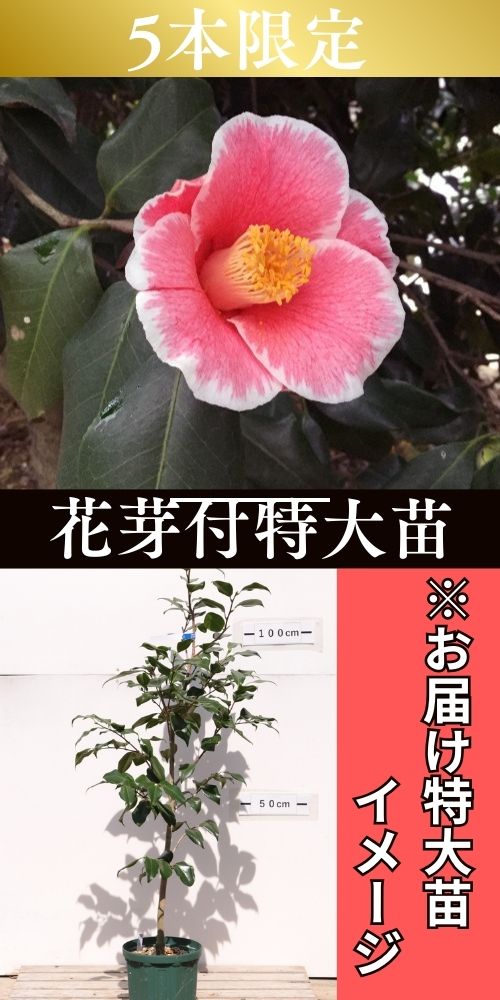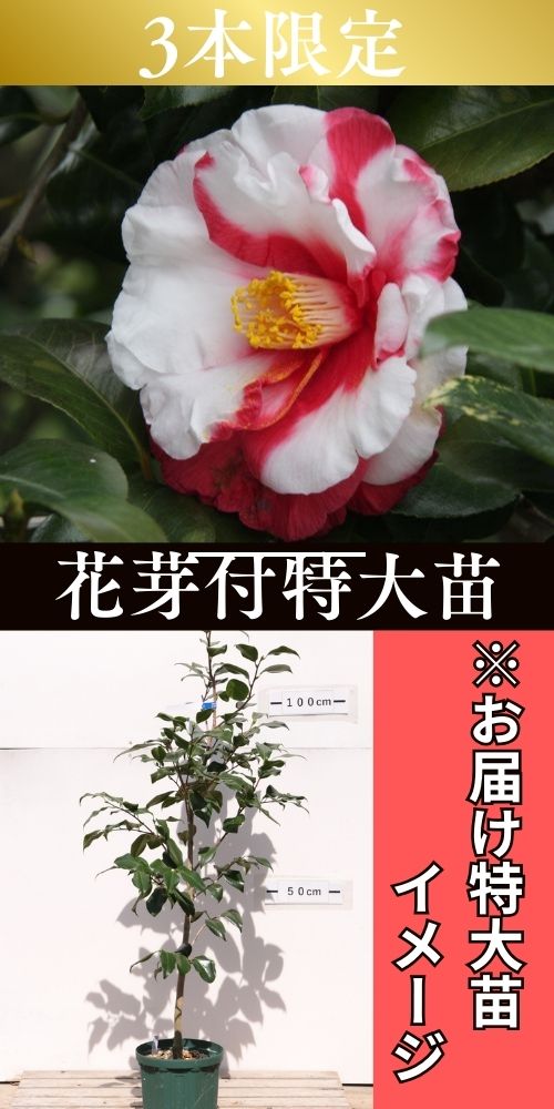 江戸椿の代表花。美しい艶葉と華やかでありながら整った花形は現代でも広く愛されている。成長が遅く、コンパクトに仕立てられる。