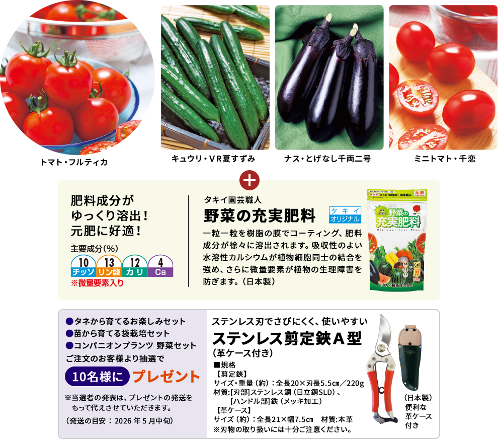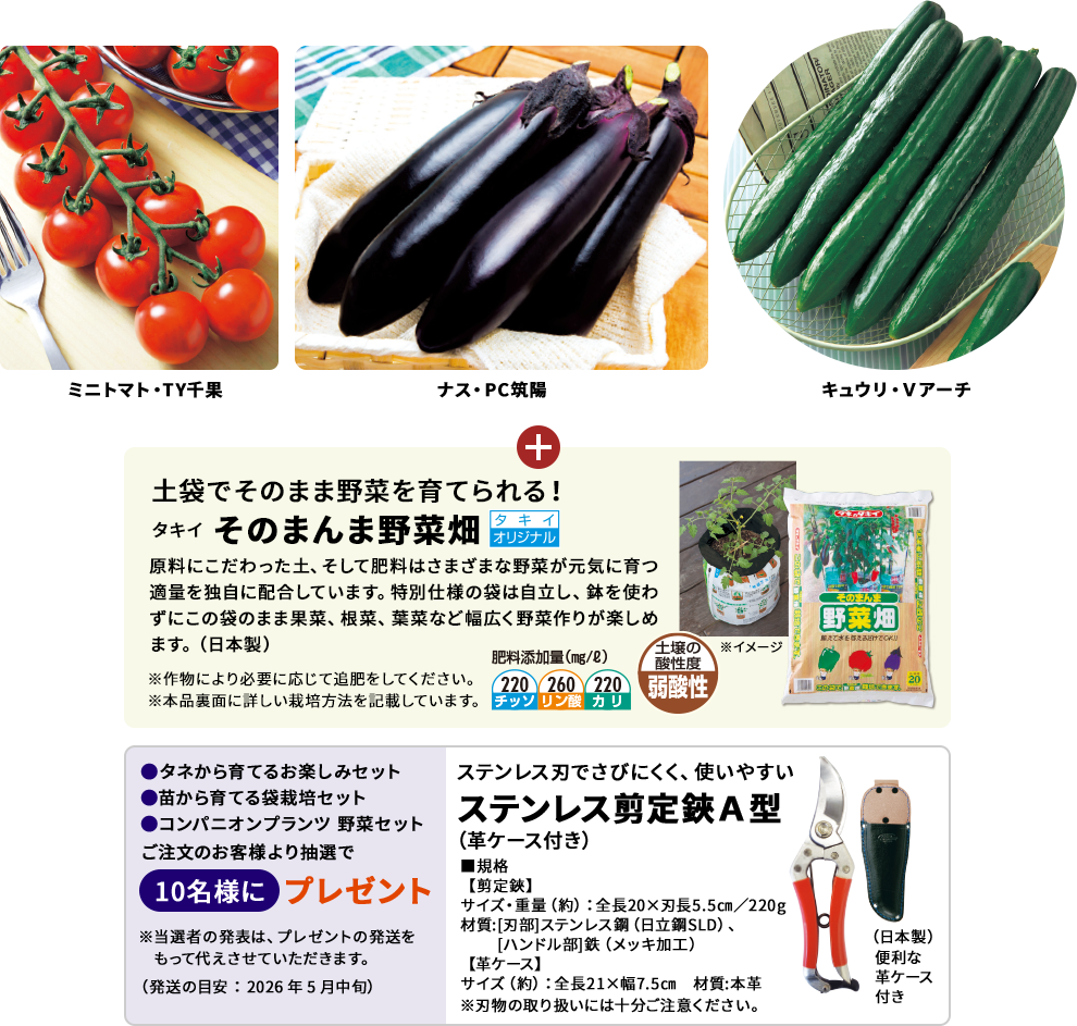 ●ミニトマト・TY千果苗 ●ナス・PC筑陽苗 ●キュウリ・Vアーチ苗