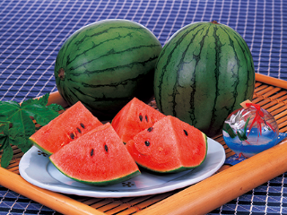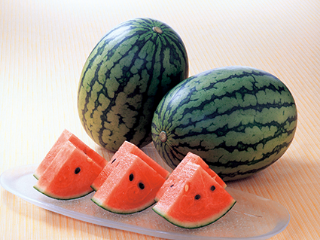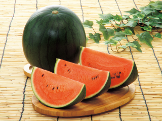 改良を積み重ねて生まれた小玉の品種です。茨城県は昼夜の温度差が大きく日照時間が長いため、甘みの強いみずみずしいスイカになります。手にのるほどの大きさですが、皮が薄い分甘い果肉と果汁がたっぷり詰まっておりズッシリと重く、シャリっとした食感もお楽しみいただけます。