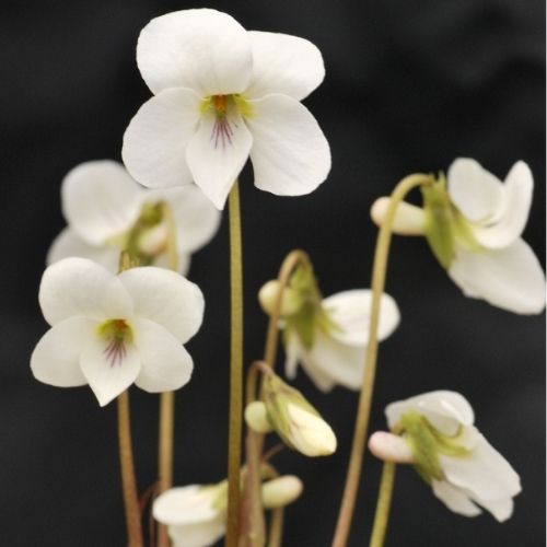 東京都八王子市の小仏峠で見つかったアカネスミレの純白品種。丈夫で花付き良い。雨は避けて夏場は日陰で管理。