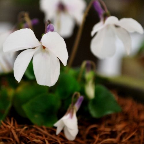 ウスベニヒゴスミレの純白品種。早咲き。多花性で強健。切葉。