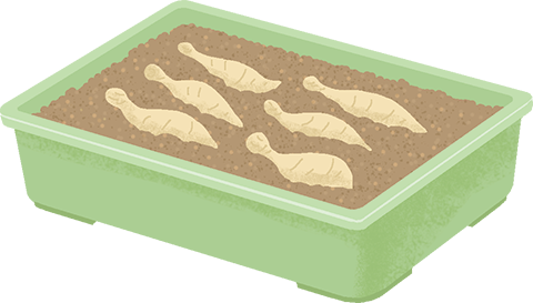 植え付けの約2週間前に、培養土を入れたトレイに球根を伏せ、芽出しをする。