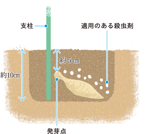 発芽点を上にして植え付け、約5㎝覆土する。