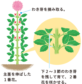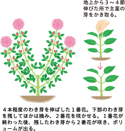 ダリアには「天花仕立て」と「摘芯仕立て」があります。天花仕立ては、主茎を伸ばして天花を咲かせる方法です。摘芯仕立ては、主茎が地上から3~4節伸びた時に中心の芯を摘み、4本程度のわき芽を伸ばして草姿にボリュームを出す方法です。