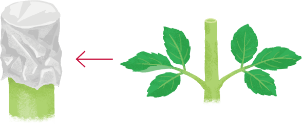 摘芯仕立てでは葉が展開する前(閉じている状態)に葉を指で開いて芯を摘みます。摘む芯が太くて茎に穴があいたら、茎の地際に細いキリなどで小さい穴をあけて水が抜けるようにしましょう。