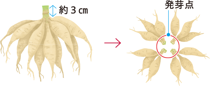 球根が大きくなっていたら、発芽点を残して切り分ける。