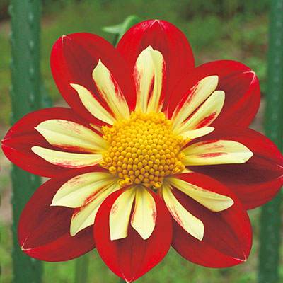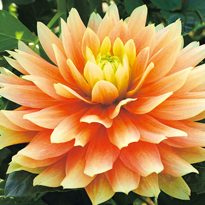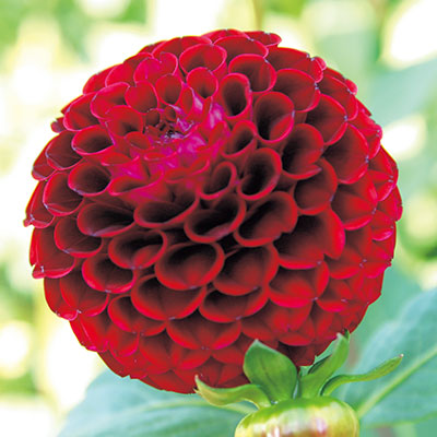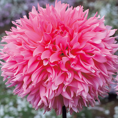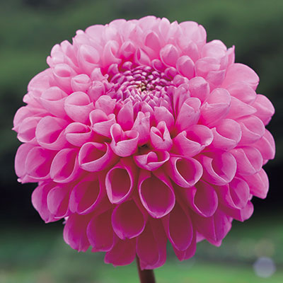 デコラティブ咲き代表的なダリアの花形。幅広の花弁が規則正しく幾重にも重なり、豪華な印象を与える。