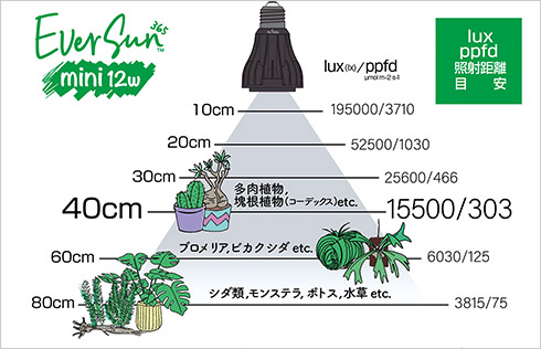 植物育成において重要なのが、「LEDとの距離」です。照射していてもその距離が適正でなければ光量が不足し、徒長してしまうことも。例えば、サボテンとコケでは求める光環境がまったく異なります。