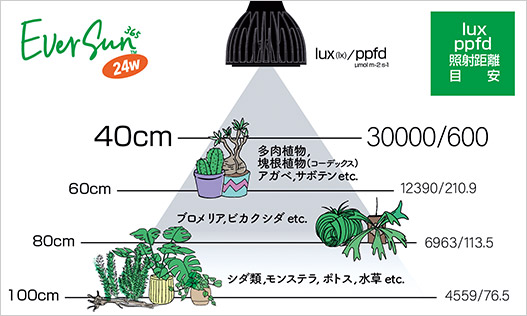 ※最適照射距離は植物の種類により異なります。種類によっては照射距離が近いと葉焼けを起こす可能性がございます。