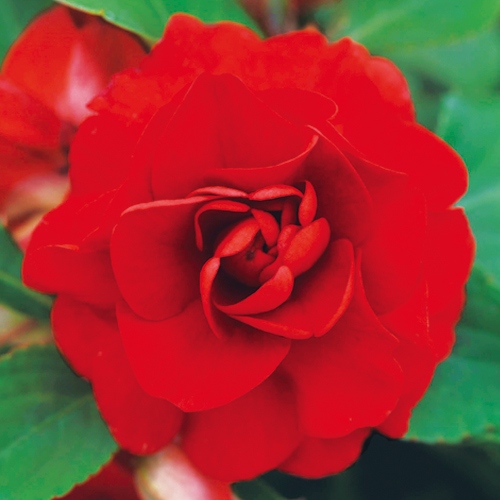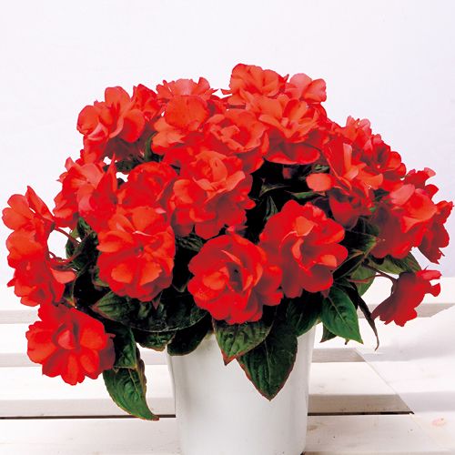 赤色花。ユニークな八重咲きのニューギニアインパチェンス。株張りがよく、育てやすい。ツリフネソウ科