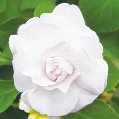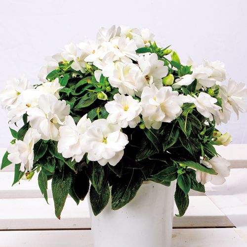 白色花。花弁が幾重にも重なり、バラのように咲き誇る姿が非常に美しい。草姿はこんもりとまとまる。べと病耐性を備え、枯れづらい性質にパワーアップ。ツリフネソウ科
