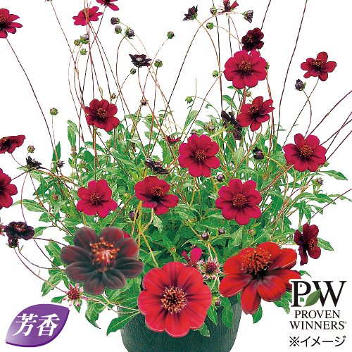 径3~3.5cmの一重花。深みのある赤褐色で、シックな植栽に向く。花にはチョコレートに似た香りがあり、暑さに強く春~秋まで咲く。キク科