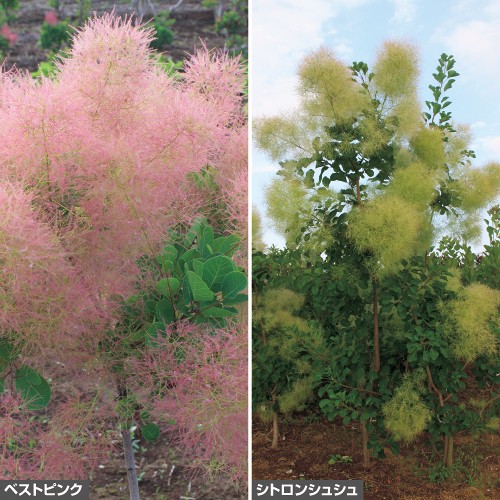 春にはフワフワとしたピンクの花を咲かせ、葉は波打つような起伏があり、赤紫色の葉が秋には輝かしいオレンジ色や赤色に紅葉する。ウルシ科