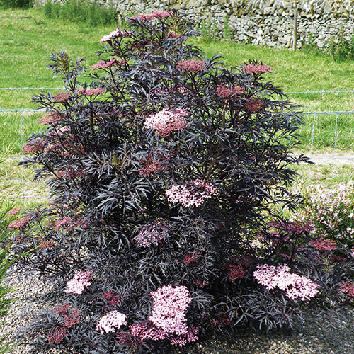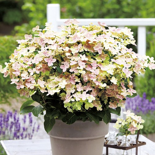 咲き始めはバニラホワイト色で、徐々にピンク色に変化する花が魅力的。軸色が赤く、花色とのコントラストも美しい。アジサイ科